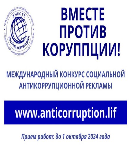 Международный молодежный конкурс социальной антикоррупционной рекламы " Вместе против коррупции". Прием конкурсных работ осуществляется на сайте конкурса www.anticorruption.life до 1 октября 2023г.